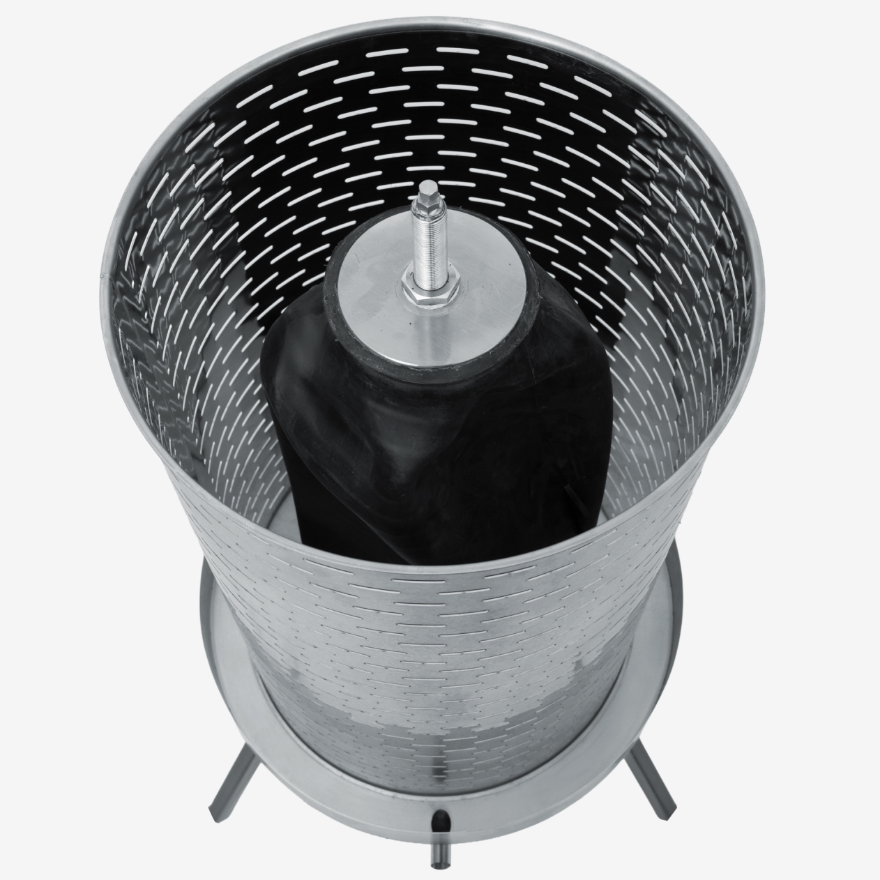 Сок проходит через отверстия в стенках и дне корзины и стекает в поддон. Далее, благодаря наклонному носику, жидкость легко переливается в подготовленную ёмкость. Поддон изготовлен из пищевой нержавеющей стали марки AISI 430 и дополнительно покрыт снаружи специальной краской, разрешённой для использования в пищевой промышленности. Высота его стенок составляет 70 мм, что обеспечивает удобство эксплуатации и предотвращает переливание.