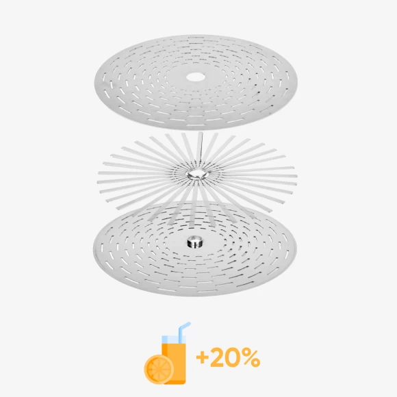 Система представляет собой комплект из трёх перфорированных дисков, изготовленных из пищевой нержавеющей стали AISI 430. Особая форма и продуманное расположение отверстий создают между мешками с измельчёнными фруктами, ягодами или овощами свободное пространство высотой около 1 мм, по которому сок быстрее и свободнее перемещается от центра бункера к его стенкам 🥤.