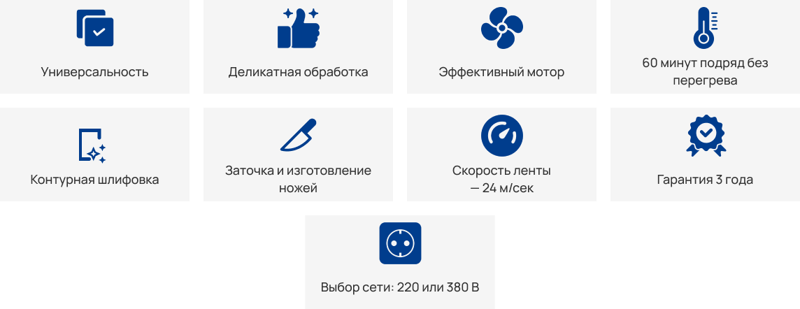 Мощный двигатель на 1,5 кВт позволяет производить обработку металлов и прочных сплавов. Он также обеспечивает высокую скорость движения ленты — до 24 м/сек (до 45 м/сек для модели с частотным преобразователем). Показатели в несколько раз выше, чем у аналогов. Заточка ножей, инструмента — за секунды!